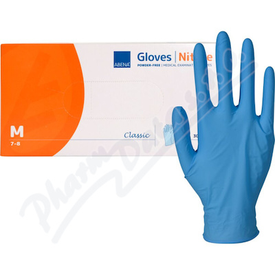 Vyšetřovací nitrilové rukavice Abena Classic, nepudrované, nesterilní. Dostupné ve velikostech S, M, L, XL. Lze je použít pro různé úkony, jako je úklid, ošetřování, manipulace s potravinami, laboratorní práce, manipulace s léky, apod..