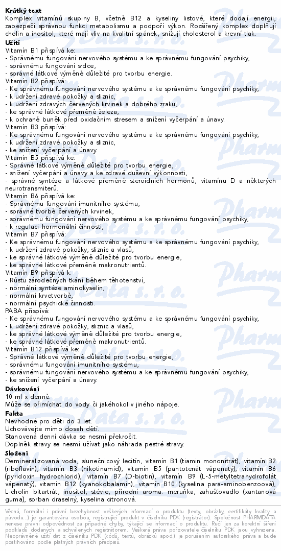Komplex vitamínů skupiny B, včetně B12 a kyseliny listové, které dodají energii, zabezpečí správnou funkci metabolismu a podpoří výkon. Rozšířený komplex doplňují cholin a inositol, které mají vliv na kvalitní spánek, snižují cholesterol a krevní tlak.