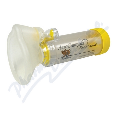 Antistatický inhalační nástavec AeroChamber Plus s ventilem, s indikátorem inspiračního průtoku Flow-Vu a maskou pro děti 1 - 5 let, pro inhalační podávání léků (vdechování). Léky se dostávají přímo do dýchacích cest, kde mají velký léčebný účinek a minim