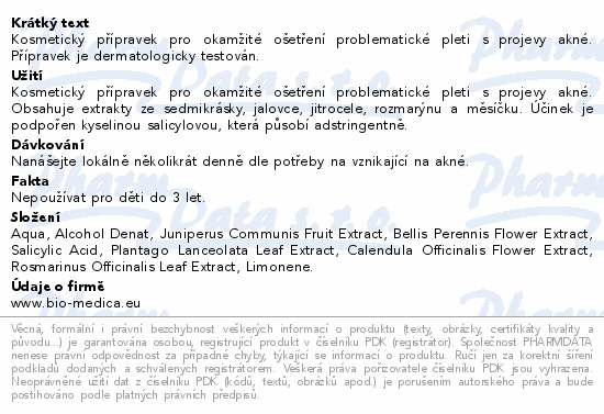 Kosmetický přípravek pro okamžité ošetření problematické pleti s projevy akné. Přípravek je dermatologicky testován.