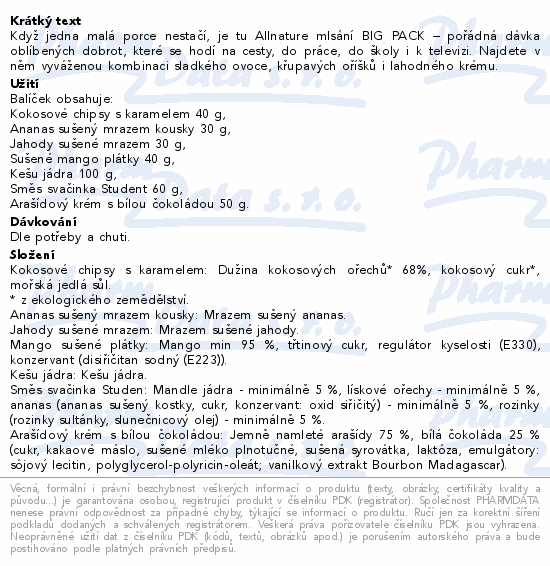 Když jedna malá porce nestačí, je tu Allnature mlsání BIG PACK – pořádná dávka oblíbených dobrot, které se hodí na cesty, do práce, do školy i k televizi. Najdete v něm vyváženou kombinaci sladkého ovoce, křupavých oříšků i lahodného krému.