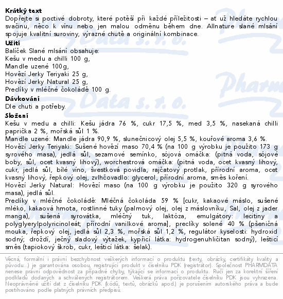 Dopřejte si poctivé dobroty, které potěší při každé příležitosti – ať už hledáte rychlou svačinu, něco k vínu nebo jen malou odměnu během dne. Allnature slané mlsání spojuje kvalitní suroviny, výrazné chutě a originální kombinace.