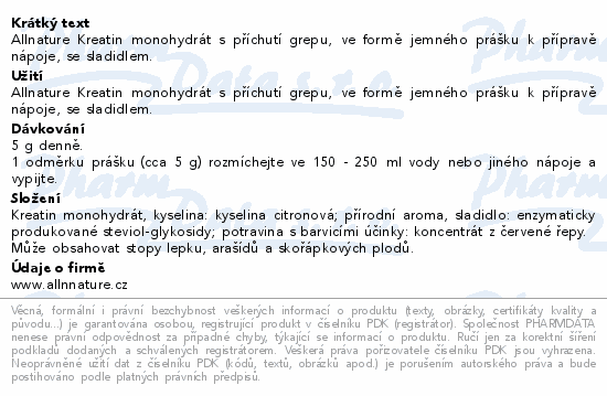 Allnature Kreatin monohydrát s příchutí grepu, ve formě jemného prášku k přípravě nápoje, se sladidlem.