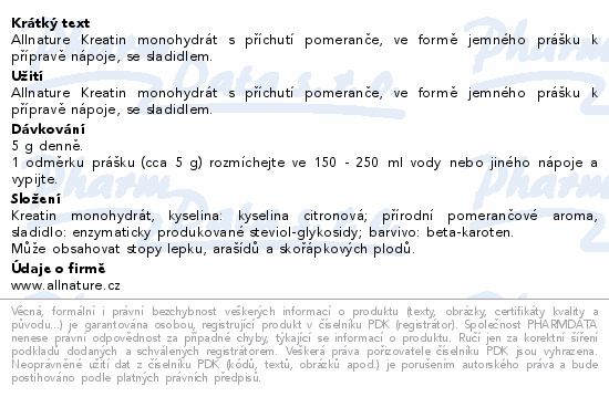 Allnature Kreatin monohydrát s příchutí pomeranče, ve formě jemného prášku k přípravě nápoje, se sladidlem.