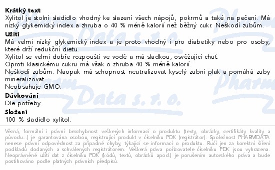 Xylitol je stolní sladidlo vhodný ke slazení všech nápojů, pokrmů a také na pečení. Má nízký glykemický index a zhruba o 40 % méně kalorií než běžný cukr. Neškodí zubům.