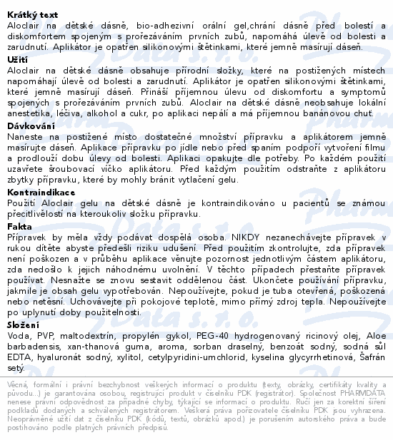 Aloclair na dětské dásně, bio-adhezivní orální gel, chrání dásně před bolestí a diskomfortem spojeným s prořezáváním prvních zubů, napomáhá úlevě od bolesti a zarudnutí. Aplikátor je opatřen silikonovými štětinkami, které jemně masírují dáseň.