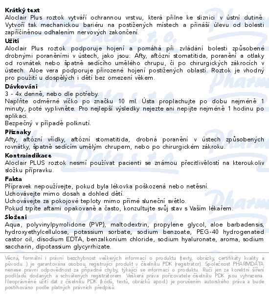 Aloclair Plus roztok vytváří ochrannou vrstvu, která přilne ke sliznici v ústní dutině. Vytvoří tak mechanickou bariéru na postižených místech a přináší úlevu od bolesti zapříčiněnou odhalením nervových zakončení.