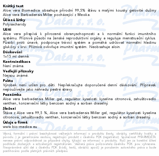Aloe vera Biomedica obsahuje přírodní 99, 5% šťávu s malými kousky gelovité dužiny Aloe vera Barbadensis Miller pocházející z Mexika.