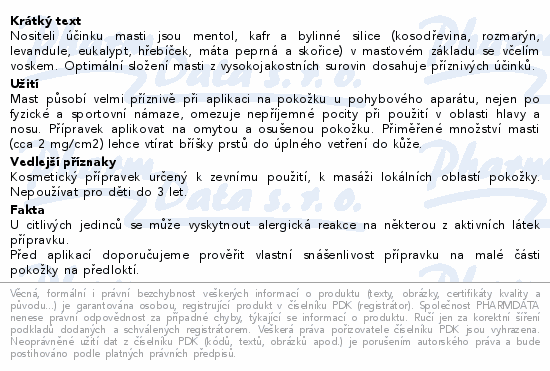 Nositeli účinku masti jsou mentol, kafr a bylinné silice (kosodřevina, rozmarýn, levandule, eukalypt, hřebíček, máta peprná a skořice) v masťovém základu se včelím voskem. Optimální složení masti z vysokojakostních surovin dosahuje příznivých účinků.