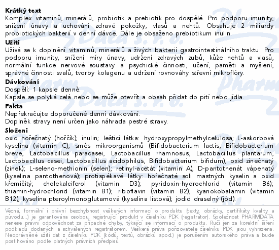 Komplex vitaminů, minerálů, probiotik a prebiotik pro dospělé. Pro podporu imunity, snížení únavy a uchování zdravé pokožky, vlasů a nehtů. Obsahuje 2 miliardy probiotických bakterií v denní dávce. Dále je obsaženo prebiotikum inulin.