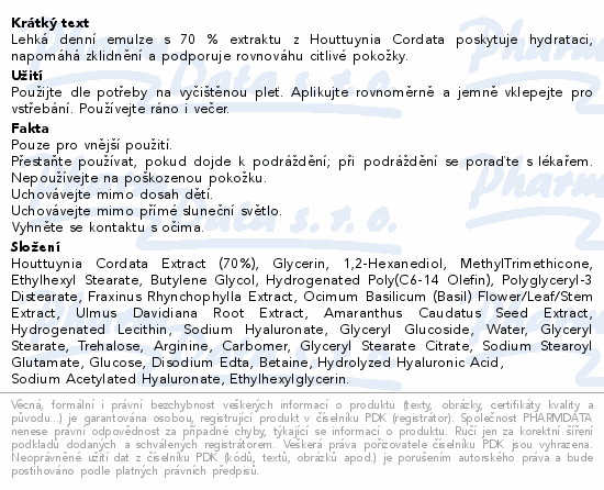 Lehká denní emulze s 70 % extraktu z Houttuynia Cordata poskytuje hydrataci, napomáhá zklidnění a podporuje rovnováhu citlivé pokožky.