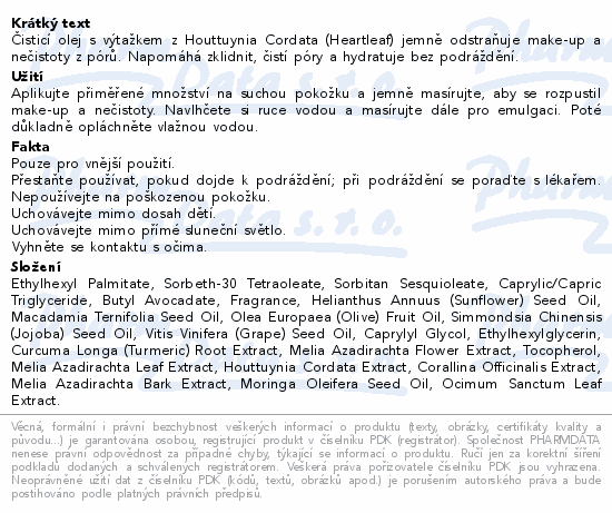 Čisticí olej s výtažkem z Houttuynia Cordata (Heartleaf) jemně odstraňuje make-up a nečistoty z pórů. Napomáhá zklidnit, čistí póry a hydratuje bez podráždění.