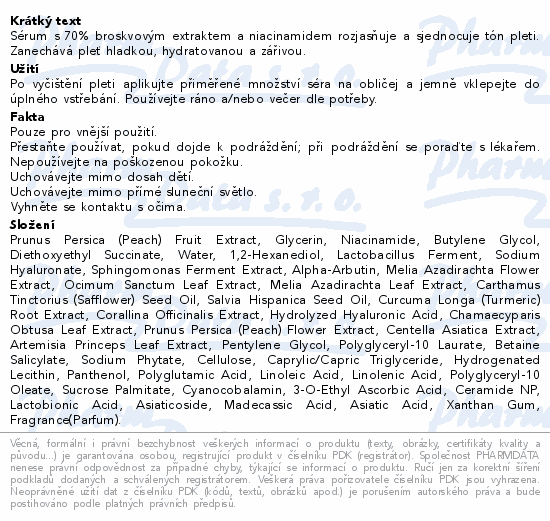 Sérum s 70% broskvovým extraktem a niacinamidem rozjasňuje a sjednocuje tón pleti. Zanechává pleť hladkou, hydratovanou a zářivou.