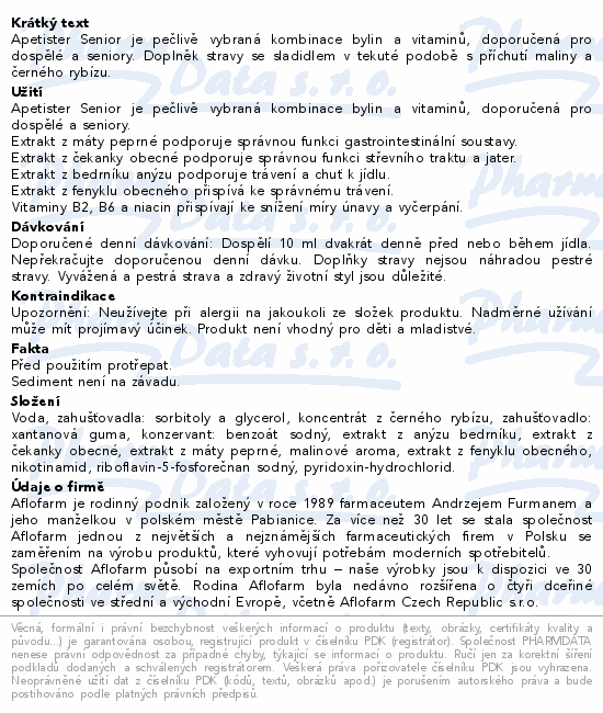 Apetister Senior je pečlivě vybraná kombinace bylin a vitaminů, doporučená pro dospělé a seniory. Doplněk stravy se sladidlem v tekuté podobě s příchutí maliny a černého rybízu.