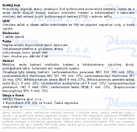 Probiotický doplněk stravy obsahující živé lyofilizované probiotické bakterie. Jedná se o směs devíti různých kmenů bakterií mléčného kvašení a bifidobakterií v celkovém množství 460 miliard živých lyofilizovaných bakterií (CFU) v jednom sáčku.