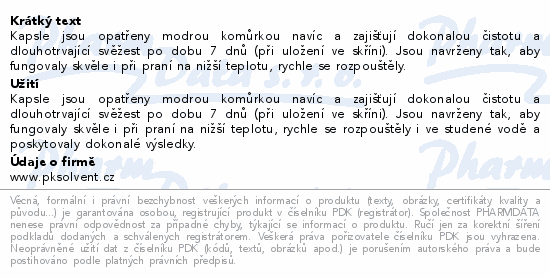 Kapsle jsou opatřeny modrou komůrkou navíc a zajišťují dokonalou čistotu a dlouhotrvající svěžest po dobu 7 dnů (při uložení ve skříni). Jsou navrženy tak, aby fungovaly skvěle i při praní na nižší teplotu, rychle se rozpouštěly.