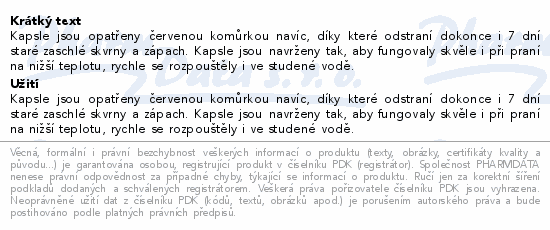 Kapsle jsou opatřeny červenou komůrkou navíc, díky které odstraní dokonce i 7 dní staré zaschlé skvrny a zápach. Kapsle jsou navrženy tak, aby fungovaly skvěle i při praní na nižší teplotu, rychle se rozpouštěly i ve studené vodě.