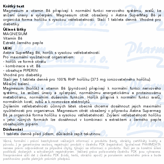Magnesium a vitamin B6 přispívají k normální funkci nervového systému, svalů, ke snížení únavy a vyčerpání. Magnesium citrát obsažený v Astina SuperMag B6 je organická forma hořčíku s vysokou vstřebatelností. Stačí 1 tableta denně. Vhodné pro diabetiky.