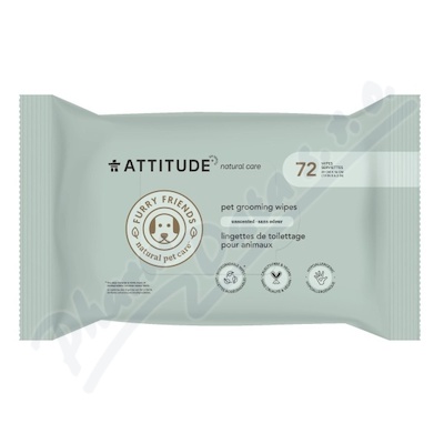Přírodní vlhčené ubrousky ATTITUDE Furry Friends pro psy a kočky, které jsou hypoalergenní a účinně odstraní špínu i pach. Jsou vhodné i pro čištění pacek, čumáčků a oblasti očí. Navíc obsahují glycerin, který prospívá zvířecí srsti.