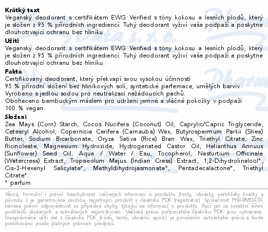 Veganský deodorant s certifikátem EWG Verified s tóny kokosu a lesních plodů, který je složen z 95 % přírodních ingrediencí. Tuhý deodorant vyživí vaše podpaží a poskytne dlouhotrvající ochranu bez hliníku.
