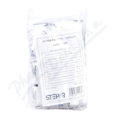 Autolékárnička I., v balení jako náhradní náplň, vybavená všemi potřebami pro první pomoc pro motoristy. Její složení odpovídá vyhlášce č. 153