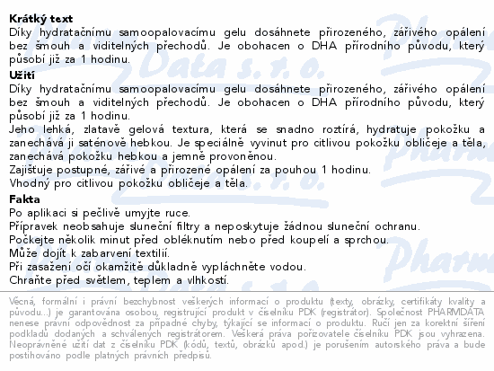 Díky hydratačnímu samoopalovacímu gelu dosáhnete přirozeného, zářivého opálení bez šmouh a viditelných přechodů. Je obohacen o DHA přírodního původu, který působí již za 1 hodinu.