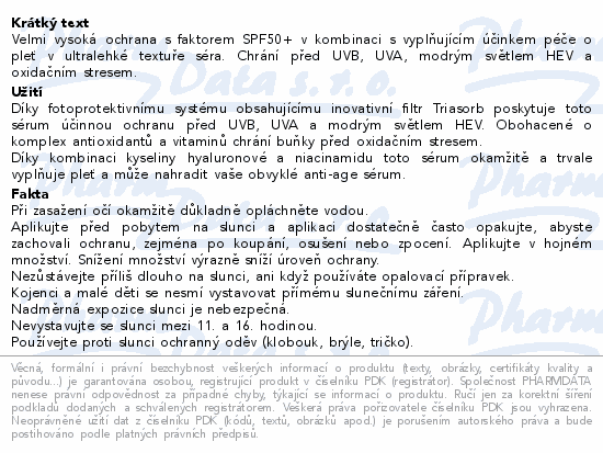 Velmi vysoká ochrana s faktorem SPF50+ v kombinaci s vyplňujícím účinkem péče o pleť v ultralehké textuře séra. Chrání před UVB, UVA, modrým světlem HEV a oxidačním stresem.