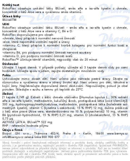 RoboFlex obsahuje unikátní látku IBUcell, směs alfa a iso-alfa kyselin z chmele, koncentrát z listů Aloe vera a vyváženou směs vitaminů.