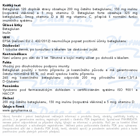 Betaglukan 120 doplněk stravy obsahuje 200 mg čistého betaglukanu, 150 mg inulinu (rozpustná vláknina) a 5 mcg vitaminu D. Betaglukan forte obsahuje 325 mg betaglukanů, 5mcg vitaminu D a 80 mg vitaminu C, přispívá k normální funkci imunitního systému.