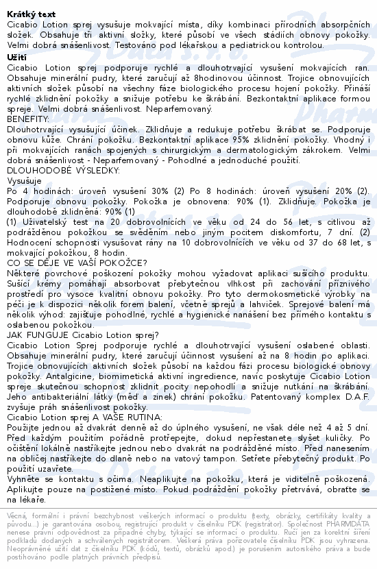 Cicabio Lotion sprej vysušuje mokvající místa, díky kombinaci přírodních absorpčních složek. Obsahuje tři aktivní složky, které působí ve všech stádiích obnovy pokožky. Velmi dobrá snášenlivost. Testováno pod lékařskou a pediatrickou kontrolou.