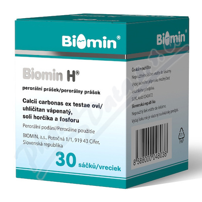 Biomin H slouží k léčbě a prevenci nedostatku vápníku. Jeden sáček t.j. 3g obsahuje kalcium 1110mg, magnesium 15 mg, fosfor 1, 8mg a mikroelementy. Vyrobeno z vaječných skořápek. Výdej je možný bez lékařského předpisu. Čtěte pozorně příbalový leták.