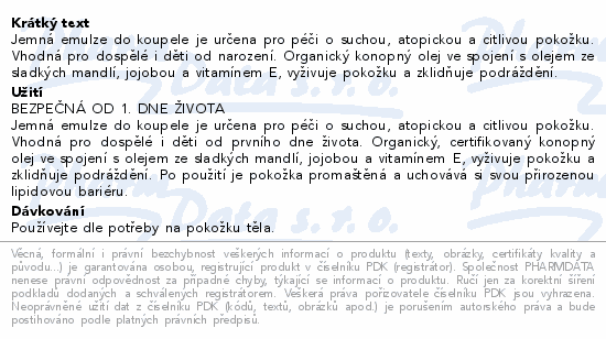 Jemná emulze do koupele je určena pro péči o suchou, atopickou a citlivou pokožku. Vhodná pro dospělé i děti od narození. Organický konopný olej ve spojení s olejem ze sladkých mandlí, jojobou a vitamínem E, vyživuje pokožku a zklidňuje podráždění.