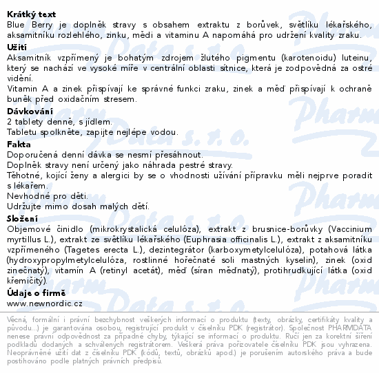 Blue Berry je doplněk stravy s obsahem extraktu z borůvek, světlíku lékařského, aksamitníku rozlehlého, zinku, mědi a vitaminu A napomáhá pro udržení kvality zraku.