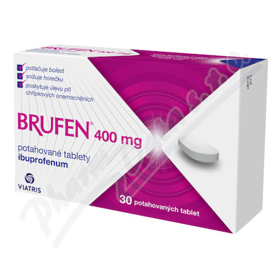 Brufen 400mg je nesteroidní antirevmatikum s výrazným účinkem snižujícím horečku, tlumícím bolest i u bolestivých stavů nerevmatického původu a s účinkem protizánětlivým. Brufen 400mg není vhodný pro děti do 12ti let. Čtěte pozorně příbalový leták.