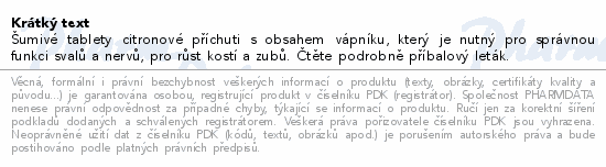 Šumivé tablety citronové příchuti s obsahem vápníku, který je nutný pro správnou funkci svalů a nervů, pro růst kostí a zubů. Čtěte pozorně příbalový leták.