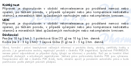 Přípravek je doporučován v období rekonvalescence po prodělané nemoci nebo operaci, po těžkém porodu, v případě vyčerpání nebo jako kompenzace nedostatku vitaminů a minerálních látek způsobených nevhodným nebo nekompletním krmivem.