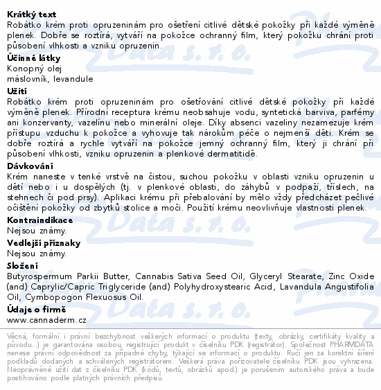 Robátko krém proti opruzeninám pro ošetření citlivé dětské pokožky při každé výměně plenek. Dobře se roztírá, vytváří na pokožce ochranný film, který pokožku chrání proti působení vlhkosti a vzniku opruzenin.