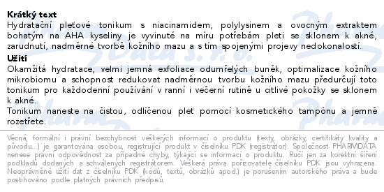Hydratační pleťové tonikum s niacinamidem, polylysinem a ovocným extraktem bohatým na AHA kyseliny je vyvinuté na míru potřebám pleti se sklonem k akné, zarudnutí, nadměrné tvorbě kožního mazu a s tím spojenými projevy nedokonalostí.
