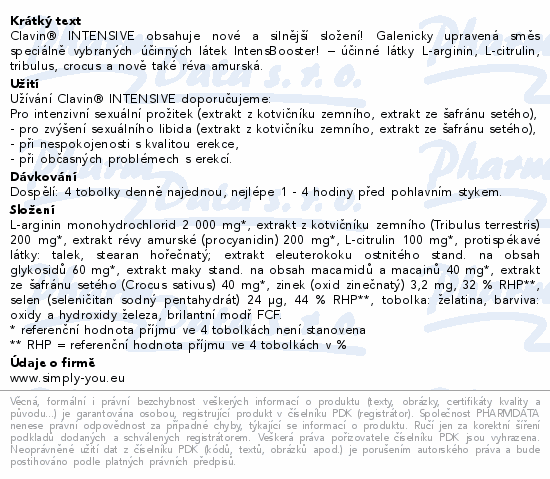 Clavin® INTENSIVE obsahuje nové a silnější složení! Galenicky upravená směs speciálně vybraných účinných látek IntensBooster! – účinné látky L-arginin, L-citrulin, tribulus, crocus a nově také réva amurská.