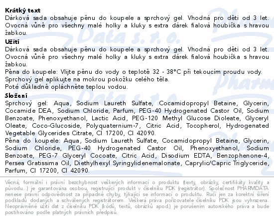 Dárková sada obsahuje pěnu do koupele a sprchový gel. Vhodná pro děti od 3 let. Ovocná vůně pro všechny malé holky a kluky s extra dárek fialová houbička s hravou žabkou.