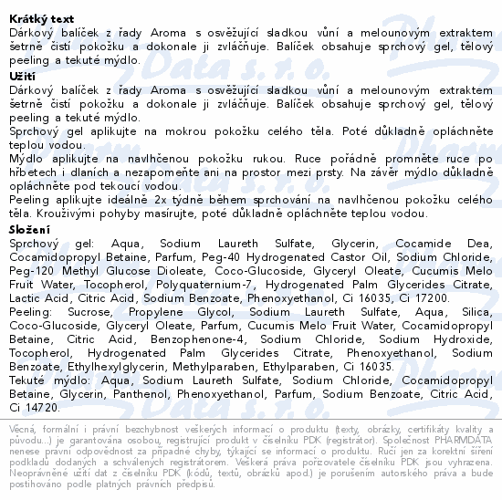 Dárkový balíček z řady Aroma s osvěžující sladkou vůní a melounovým extraktem šetrně čistí pokožku a dokonale ji zvláčňuje. Balíček obsahuje sprchový gel, tělový peeling a tekuté mýdlo.