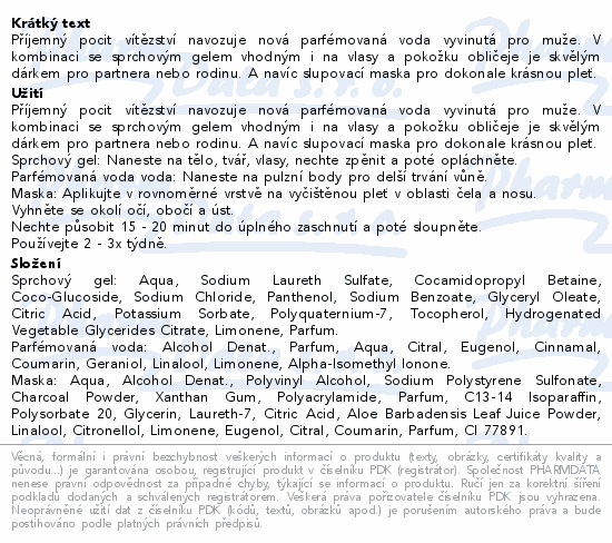 Příjemný pocit vítězství navozuje nová parfémovaná voda vyvinutá pro muže. V kombinaci se sprchovým gelem vhodným i na vlasy a pokožku obličeje je skvělým dárkem pro partnera nebo rodinu. A navíc slupovací maska pro dokonale krásnou pleť.