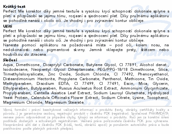 Perfect Me korektor díky jemné textuře s vysokou krycí schopností dokonale splyne s pletí a přizpůsobí se jejímu tónu, rozjasní a sjednocení pleť. Díky pružnému aplikátoru se pohodlně nanáší i okolo očí. Je vhodný i pro zvýraznění kontur obličeje.