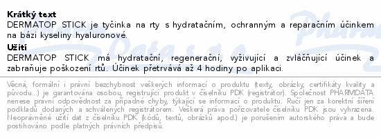 DERMATOP STICK je tyčinka na rty s hydratačním, ochranným a reparačním účinkem na bázi kyseliny hyaluronové.