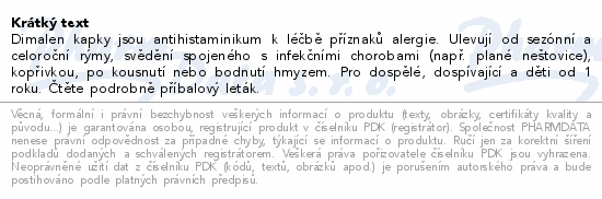 Dimalen kapky jsou antihistaminikum k léčbě příznaků alergie. Ulevují od sezónní a celoroční rýmy, svědění spojeného s infekčními chorobami (např. plané neštovice), kopřivkou, po kousnutí nebo bodnutí hmyzem. Pro dospělé, dospívající a děti od 1 roku. Čtěte pozorně příbalový leták.
