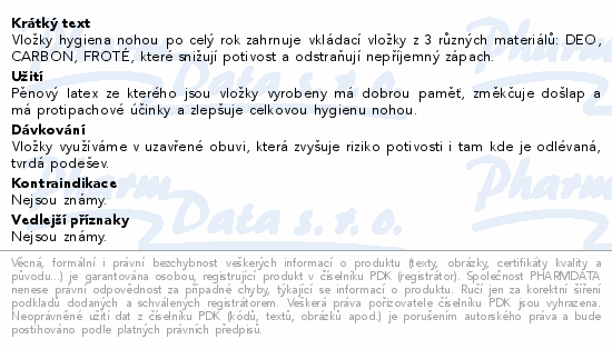 Vložky hygiena nohou po celý rok zahrnuje vkládací vložky z 3 různých materiálů: DEO, CARBON, FROTÉ, které snižují potivost a odstraňují nepříjemný zápach.