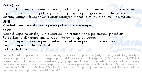 Emulze, která má ten správný masážní skluz, díky kterému masáž vhodně prokrví kůži a napomůže k uvolnění pokožky svalů a její rychlejší regeneraci. Tudíž je vhodná pro všechny druhy krátkodobých i dlouhodobých masáží a to jak před, tak i po výkonu.