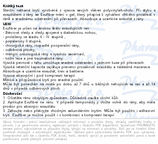 Sterilní netkané krytí vyrobené z vysoce savých vláken polyvinylalkoholu. Při styku s exsudátem z rány se Exufiber mění v gel, který přispívá k vytváření vlhkého prostředí v ráně a snadnému odstranění při převazech. Absorbuje a uzamkne exsudát z rány.