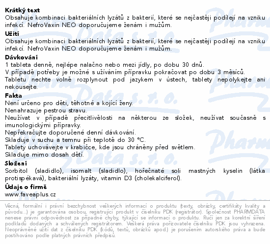 Obsahuje kombinaci bakteriálních lyzátů z bakterií, které se nejčastěji podílejí na vzniku infekcí. NefroVaxin NEO doporučujeme ženám i mužům.