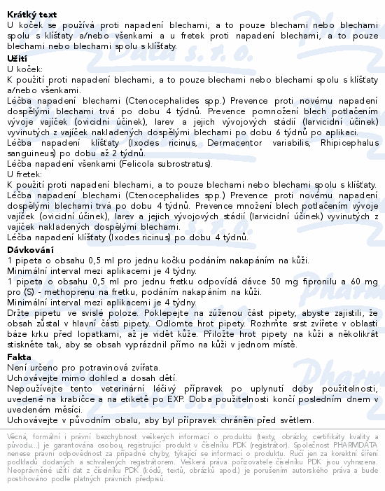 U koček se používá proti napadení blechami, a to pouze blechami nebo blechami spolu s klíšťaty a